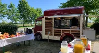 Bœuf, bleu d’auvergne, oignons confits, roquette, pickels et sauce crème miel moutarde.